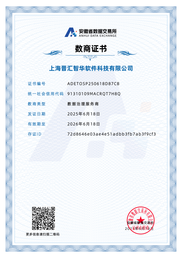 晋汇总公司成立于2016年,经过7年的行业深耕于2023年在上海成立晋汇智华运营中心,本着以数据要素市场推动数据资产化进程为使命,赋能数据资产开放流通,服务全国范围内国企、央企、投资集团、上市企业、及行业板块企业,是提供数据资产流程落地及资产入表等全流程服务的专业数商公司。